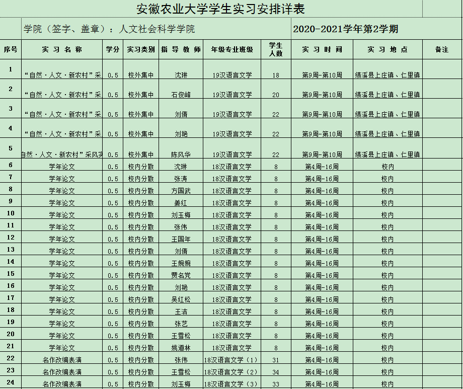 2020-2021第二学期人文社会科学学院学生实习安排详表